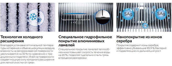 - Ag+ покрытие испарителя и корпуса внутреннего блока — против образования плесени и грибка, и размножения бактерий.