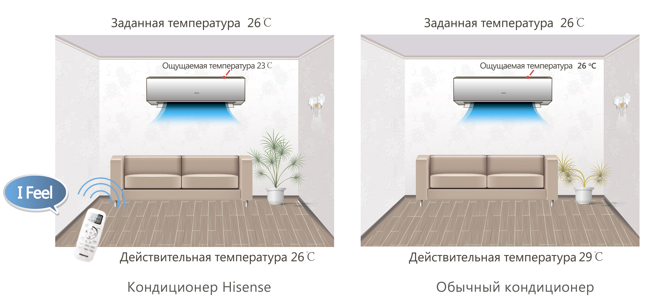 • I Feel — поддержание заданной температуры в зоне нахождения пульта ДУ. Это возможно благодаря встроенному в пульт температурному датчику.