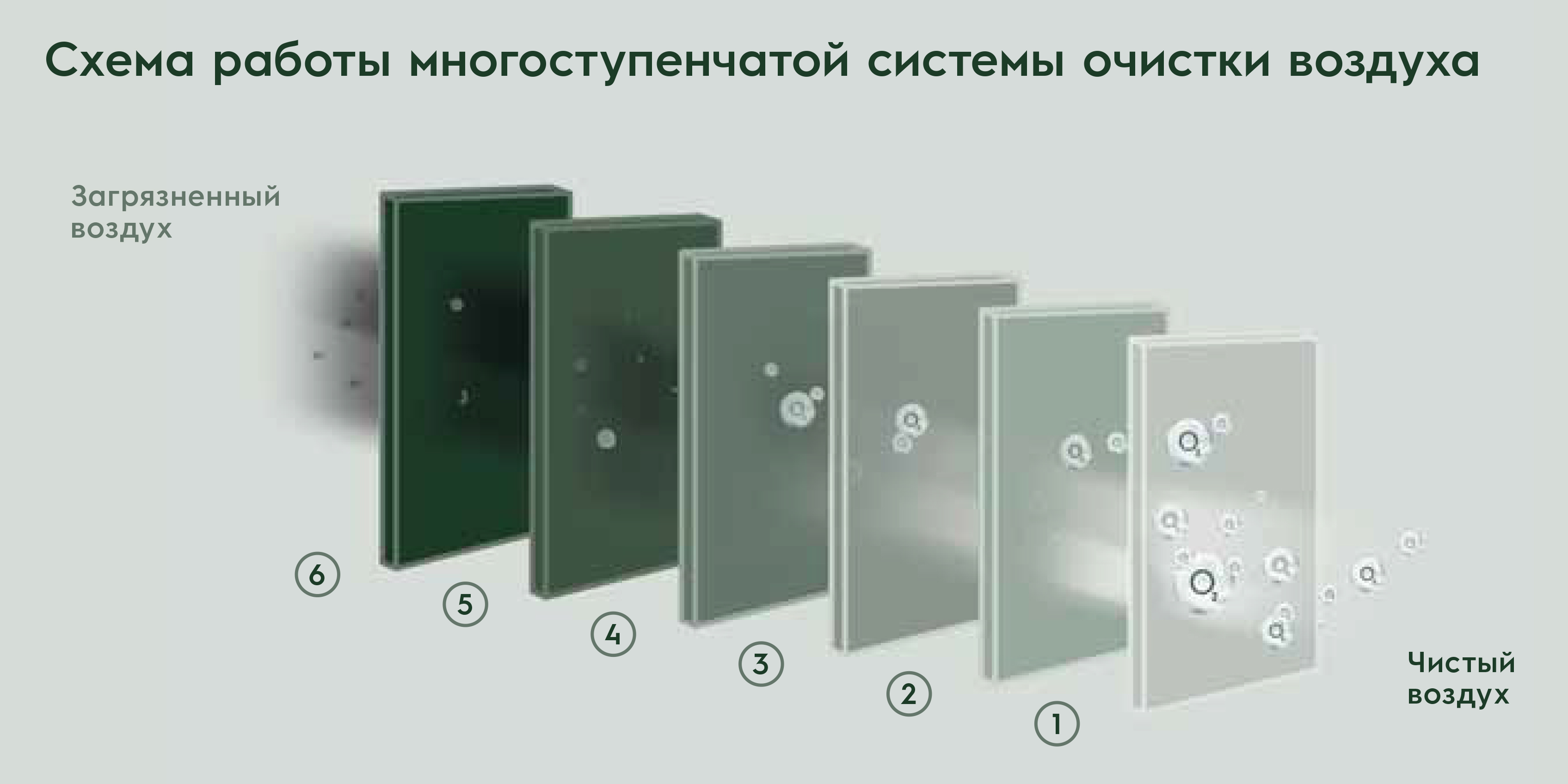 • Высокоэффективная 6-ступенчатая система фильтров очищает воздух от всевозможных загрязнений: антиклещевой, каталитический, фотокаталитический, биологический антибактериальный, фильтр с ионами серебра, катехиновый.
