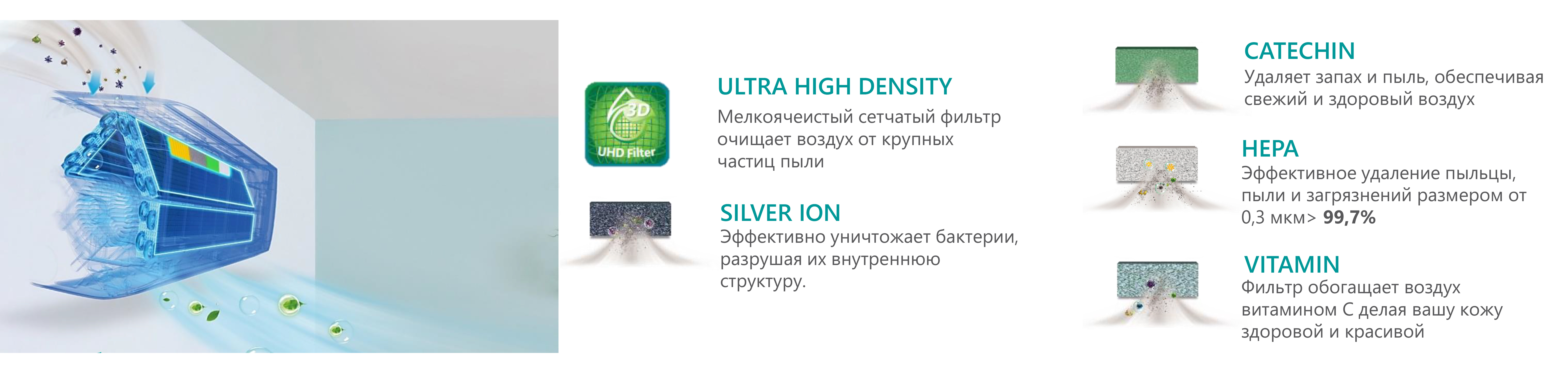 • Комплексная очистка воздуха включает в себя 5 фильтров