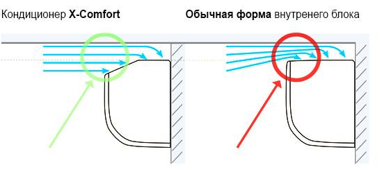• Специальная аэродинамичная форма внутреннего блока — позволяет устанавливать его максимально близко к потолку (min расстояние 5 см).