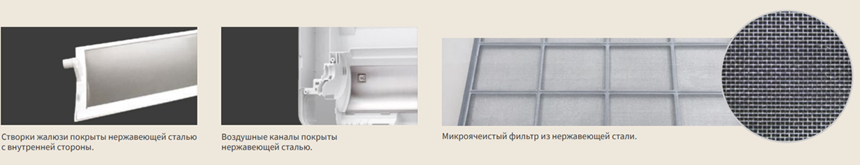 - STAINLESS CLEAN — створки жалюзи, воздушные каналы и фильтр изготовлены с применением нержавеющей стали, это обеспечивает чистоту внутри кондиционера и эффективную очистку воздуха, проходящего через него.