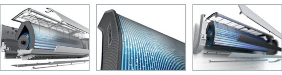 - Автоматическая роботизированная очистка фильтра — эффективно собирает специальным механизмом скопившуюся на стальном фильтре грязь и пыль, отправляет ее в специальный контейнер, который легко извлекается и моется. Такая технология обеспечивает постоянную чистоту фильтру кондиционера.