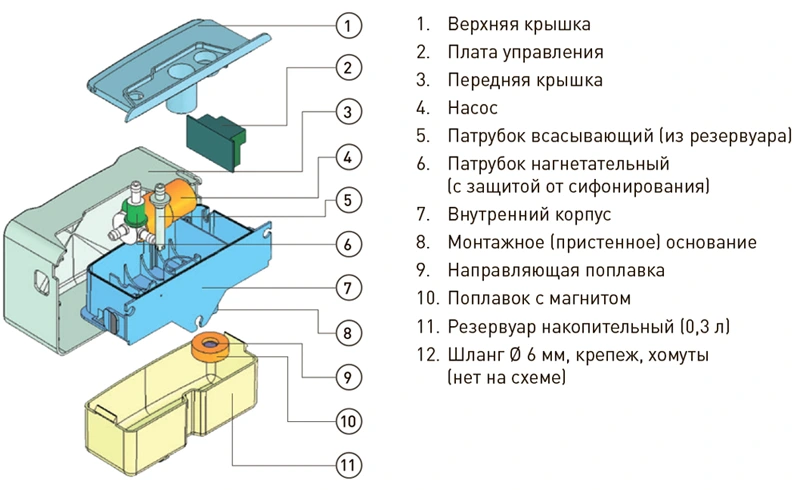 Применяется для отвода конденсата с внутренних блоков кондиционеров малой и средней производительности. Применяется в случаях, когда невозможно обеспечить гарантированный естественный сток конденсата под наклоном или в случаях, когда место вывода конденсата расположено выше уровня внутреннего блока. Насос имеет довольно низкий уровень шума — 17 дБ (А), идеально подходит для использования в жилых помещениях.