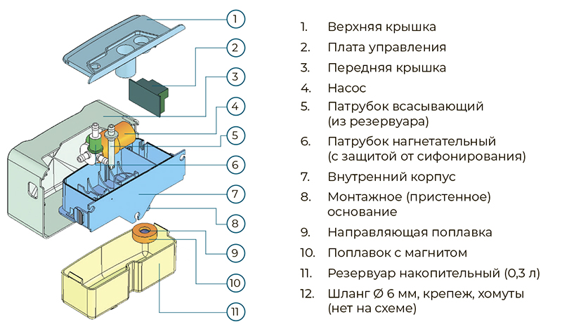 Применяется для отвода конденсата с внутренних блоков кондиционеров малой и средней производительности. Применяется в случаях, когда невозможно обеспечить гарантированный естественный сток конденсата под наклоном или в случаях, когда место вывода конденсата расположено выше уровня внутреннего блока. Насос имеет довольно низкий уровень шума — 17 дБ (А), идеально подходит для использования в жилых помещениях.