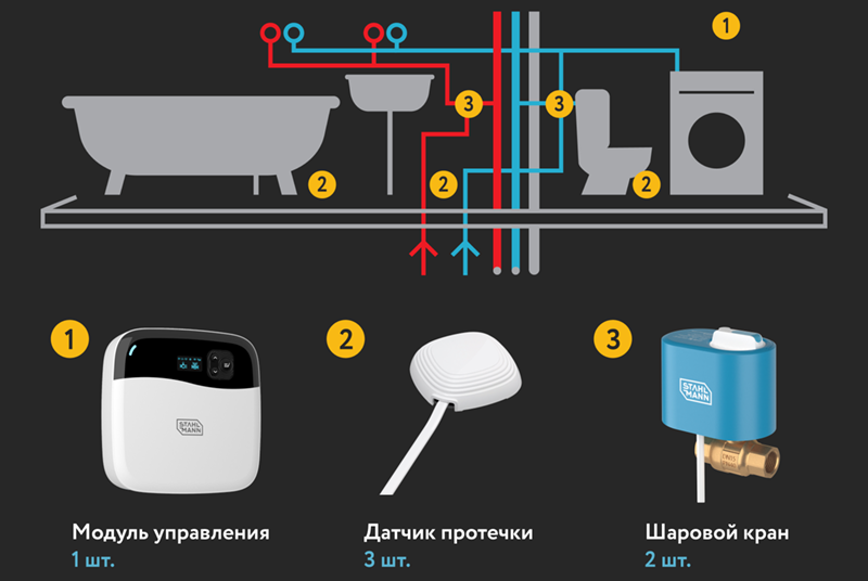 Краны STAHLMANN™ 3/4" 12В – 2 шт. Датчик STAHLMANN™ 001 – 3 шт. Модуль управления STAHLMANN™ Smart – 1 шт.