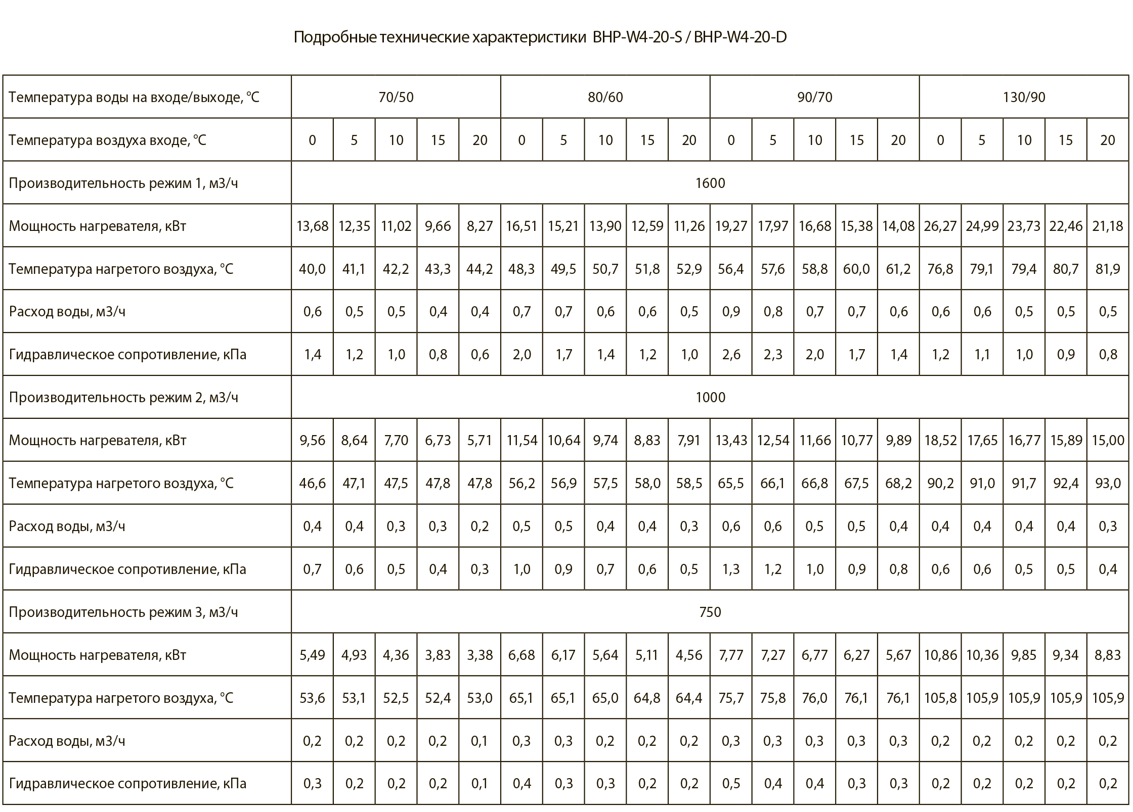 Тепловые характеристики приведены при температуре воздуха на входе +0 °С, максимальном расходе воздуха и максимальной температуре теплоносителя (указанной в таблице тепловой мощности от производителя).