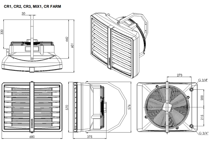 Тепловентиляторы CR устанавливаются на стенах или потолке с помощью монтажных кронштейнов под углом 90°, 60° или 30°в вертикальной плоскости. Кронштейн позволяет поворачивать агрегат в горизонтальной плоскости на угол до 78° в одну сторону, и до 50° в другую, сохраняя достаточное пространство для подключения к теплосети.