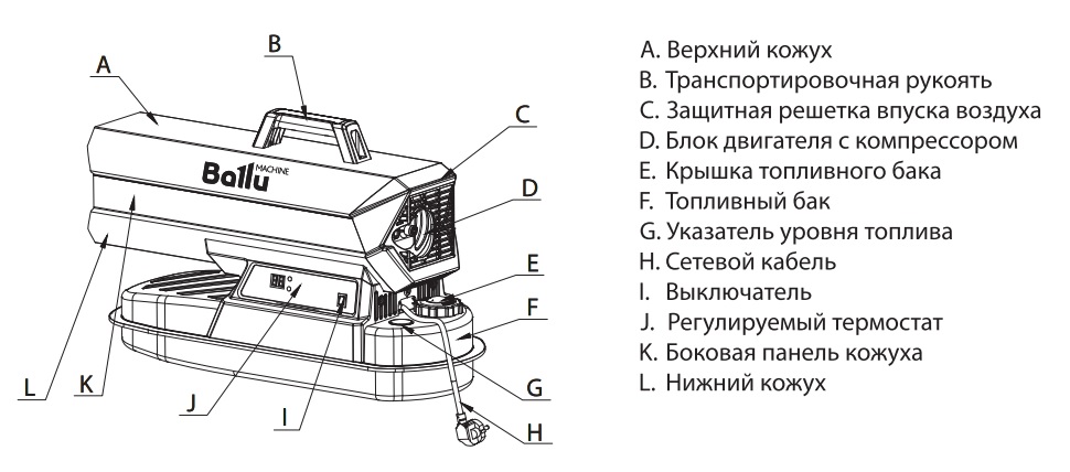 Предназначена для обогрева промышленных помещений и строительных площадок до 100 кв. м, работает на дизельном топливе. Устройство может работать в непрерывном режиме до 15 часов. Встроенный термостат позволяет эксплуатировать теплогенератор в температурных условиях от -10 °С до +45 °С. Электронное управление расположено на корпусе прибора. Объем топливного бака составляет 12 литров.