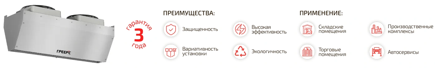 Промышленные воздушно-тепловые завесы ГРЕЕРС ЗВП-М используются для защиты дверных проемов и ворот от проникновения холодного воздуха в зимний период и теплого воздуха в летний период. Завесы Греерс ЗВП-М отсекают уличный воздух, уменьшают теплопотери в помещении, а также препятствуют попаданию в помещение уличных газов, пыли, смога, аллергенов и летающих насекомых. Применяются в производственных помещениях, логистических центрах, цехах, автосервисах, гаражах, складах и т.д. Завесы изготовлены из оцинкованной стали, имеют конструкцию в виде моноблока, сопло изготовлено из ABS пластика. Воздушные завесы ГРЕЕРС ЗВП-М оснащены трёхскоростным вентилятором с двигателем типа АС и укомплектованы монтажными элементами.