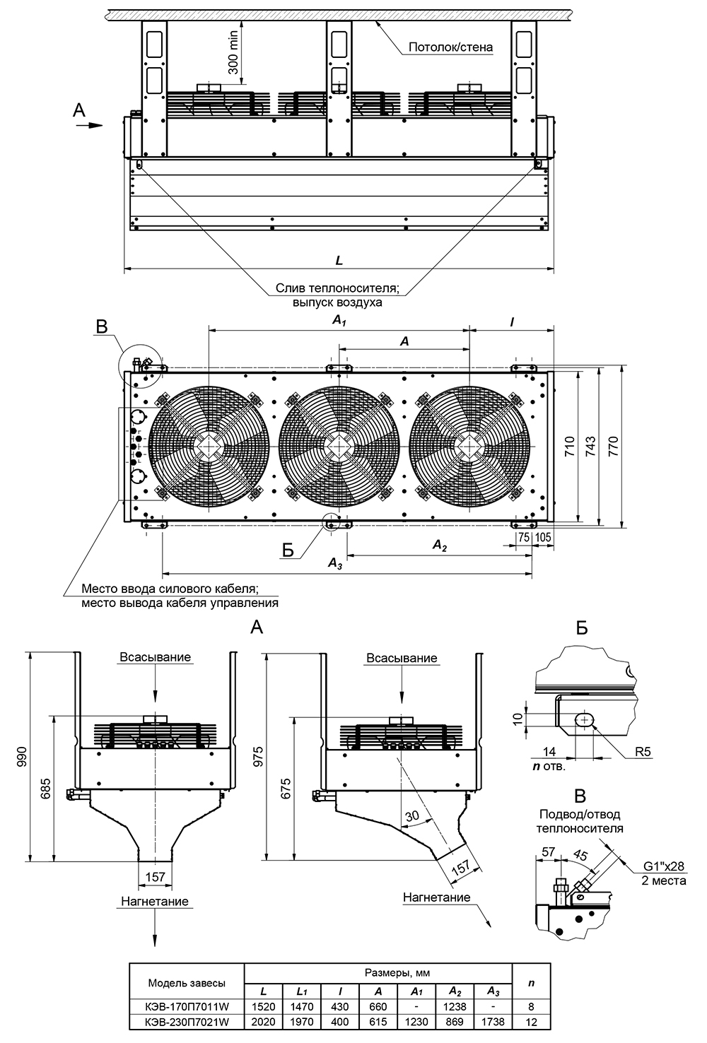 Промышленная тепловая завеса шиберующего (отсекающего) типа из оцинкованной стали с защитой корпуса IP54 (допускается капельная влага, туман). Устанавливается внутри помещения, горизонтально над проемом или вертикально, сбоку от него, как можно ближе к краю. При большой ширине проема можно располагать сразу несколько завес вплотную друг к другу и управлять ими с одного пульта. Применяется в складских помещениях, гаражах, производственных предприятиях, ангарах, самолетных и вертолетных площадках, автомойках и других помещениях большой площади.