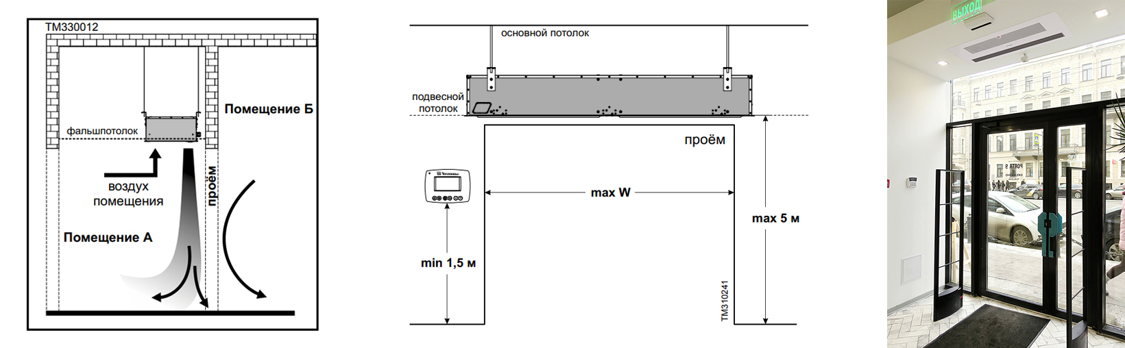Создает воздушный поток в проёме, преграждающий проникновению холодного воздуха с улицы в помещение. Встраивается в подвесной или фальш-потолок над дверным проёмом, на высоте от 3 до 5 м. Устанавливаются в магазинах, ресторанах, гостиницах, бизнес центрах и т.п. Применяются, в основном, для защиты проемов, оборудованных тамбуром.