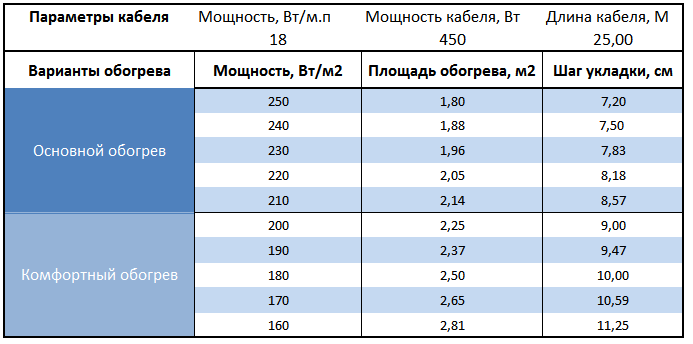 Самостоятельно высчитать какую площадь может обогреть секция нагревательного кабеля, нужно мощность секции разделить на вид обогрева (комфортный, основной или холодных помещений) и получим количество квадратных метров обогрева пола.