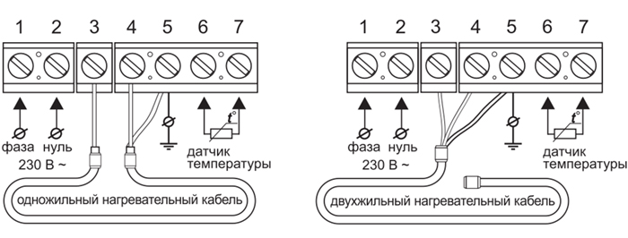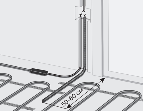 Гофрированная трубка с датчиком внутри располагается на уровне греющего кабеля, между его витками, на равном удалении от них. Другой конец трубки с установочным проводом датчика температуры внутри укладывается в подготовленную в полу канавку (штробу) и подводится к месту установки терморегулятора или распаечной коробки. Излишки трубки и установочного провода обрезаются по месту.
